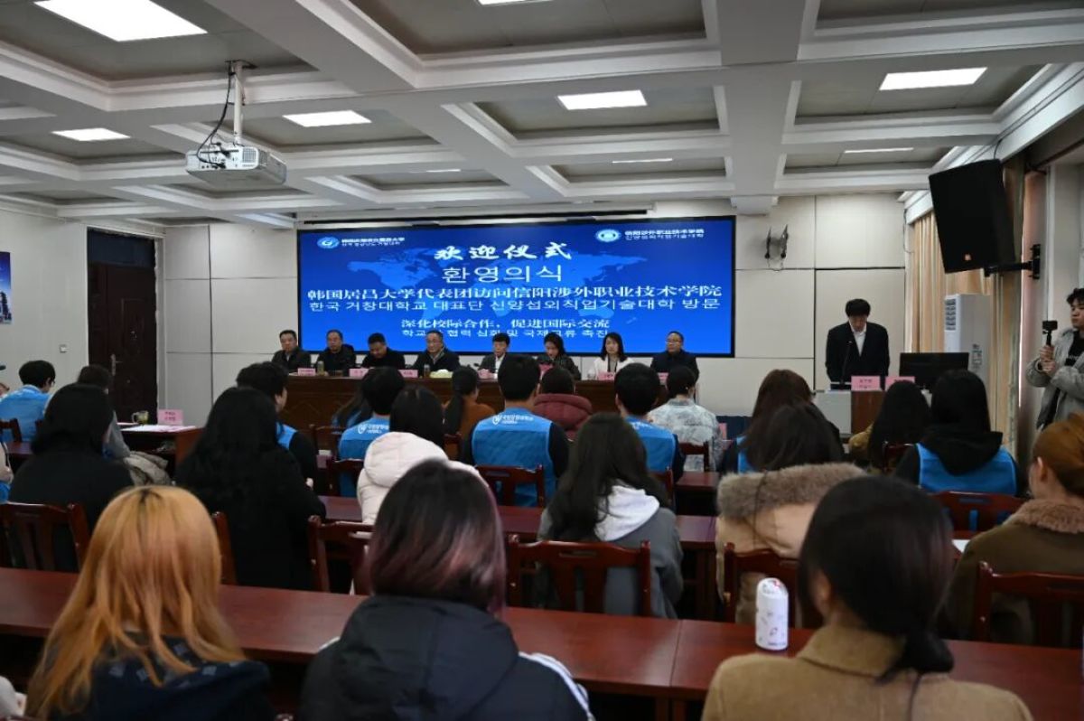 冬日暖阳遍洒校园,跨国情谊共暖人心。2025年12月16日下午,信阳涉外职业技术学院1号楼六楼会议室隆重举行韩国庆南道立居昌大学师生代表团欢迎仪式。本次仪式旨在热烈欢迎韩方代表团到访,深化两校友好合作关系,共商中韩教育文化交流发展新路径。