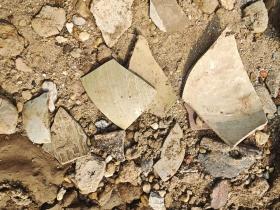 12月18日,记者来到网友提到的区域,江滩边有一定面积的裸露土地,土质松软,疑似不久前为水域。在一处水道交叉口,有一定数量器物碎片散落在土壤中,水道数米长的距离内,便发现十多处。