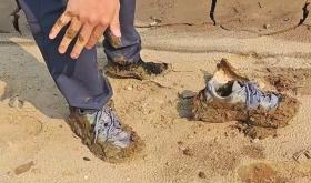 现场,这些碎片所在位置多为水道边缘,不少区域土地看似平坦、坚实,实则松软,若体重偏重或行走不慎,易陷入其中。