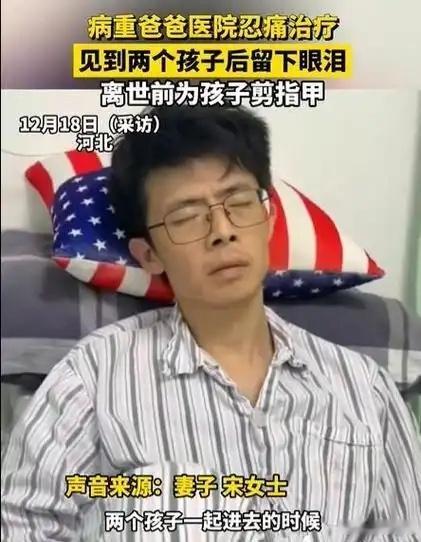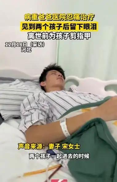 38岁病危爸爸给孩子剪指甲温柔告别!38岁病危爸爸给孩子剪指甲温柔告别 38岁病危爸爸给孩子剪指甲温柔告别 不舍泪水中的最后关怀。近日,河北一位38岁的父亲因病去世。他的妻子回忆说,自从10月丈夫被诊断出肝脓肿后,就一直在医院接受治疗。住院期间,妻子带着两个孩子来到医院探望。看到孩子们走进病房,这位父亲流下了眼泪。这是他忍受癌症疼痛和发热这么久以来第一次哭泣。