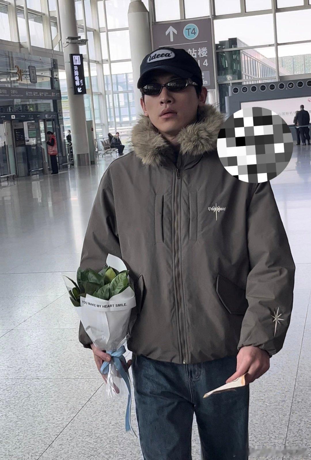 辛云来机场出发星光大赏路透,手里还抱着一捧柚子叶