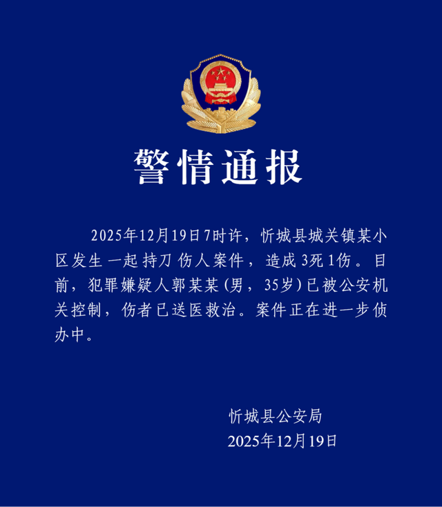 2025年12月19日7时许,忻城县城关镇某小区发生一起持刀伤人案件,造成3死1伤。目前,犯罪嫌疑人郭某某(男,35岁)已被公安机关控制,伤者已送医救治。案件正在进一步侦办中。