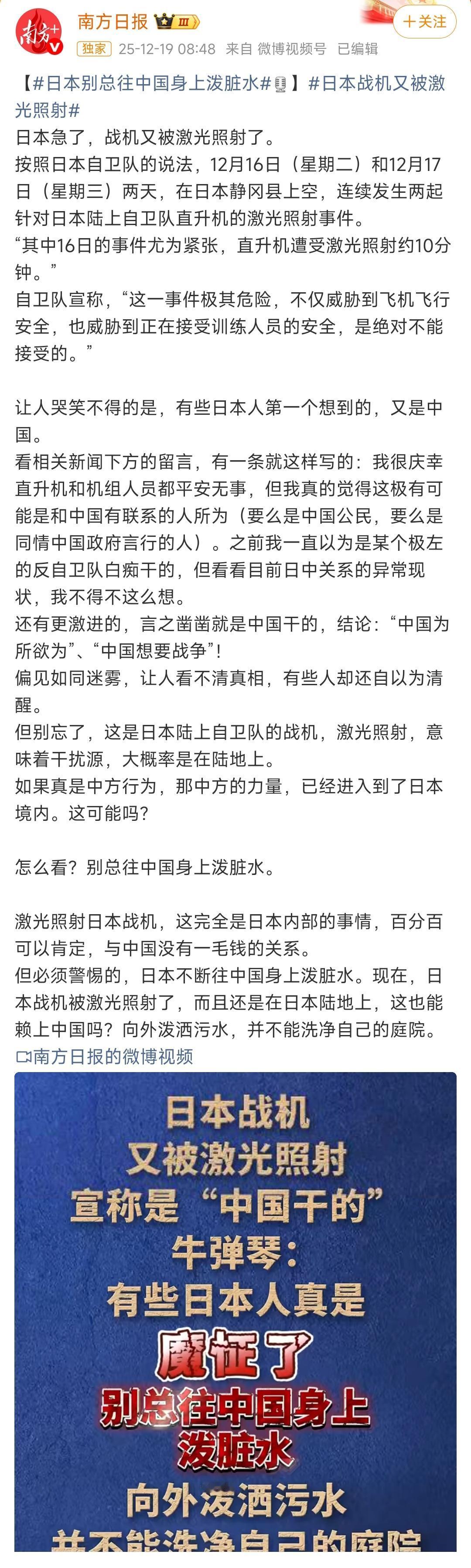 日本自卫队又炒作12月16日、17日静冈县上空连续发生两起针对日本自卫队直升机的激光照射事件。其中16日直升机遭激光照射约10分钟。 既然是在陆上,那说明这是你们自己干的。然后自卫队报警,交警方办理。 说不一定,这是日本人自己在研究激光笔、激光武器呢。 所以,这次激光照射日本战机,是日本内部事,你泼不泼脏水无所谓。 有本事你再自导自演搞一个飞机失踪的传统套路给大家看看。时代不同呢,大家都很期待看到呢!