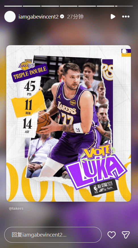 赛后,因伤缺阵的盖布-文森特在INS上转发了东契奇的三双数据海报。