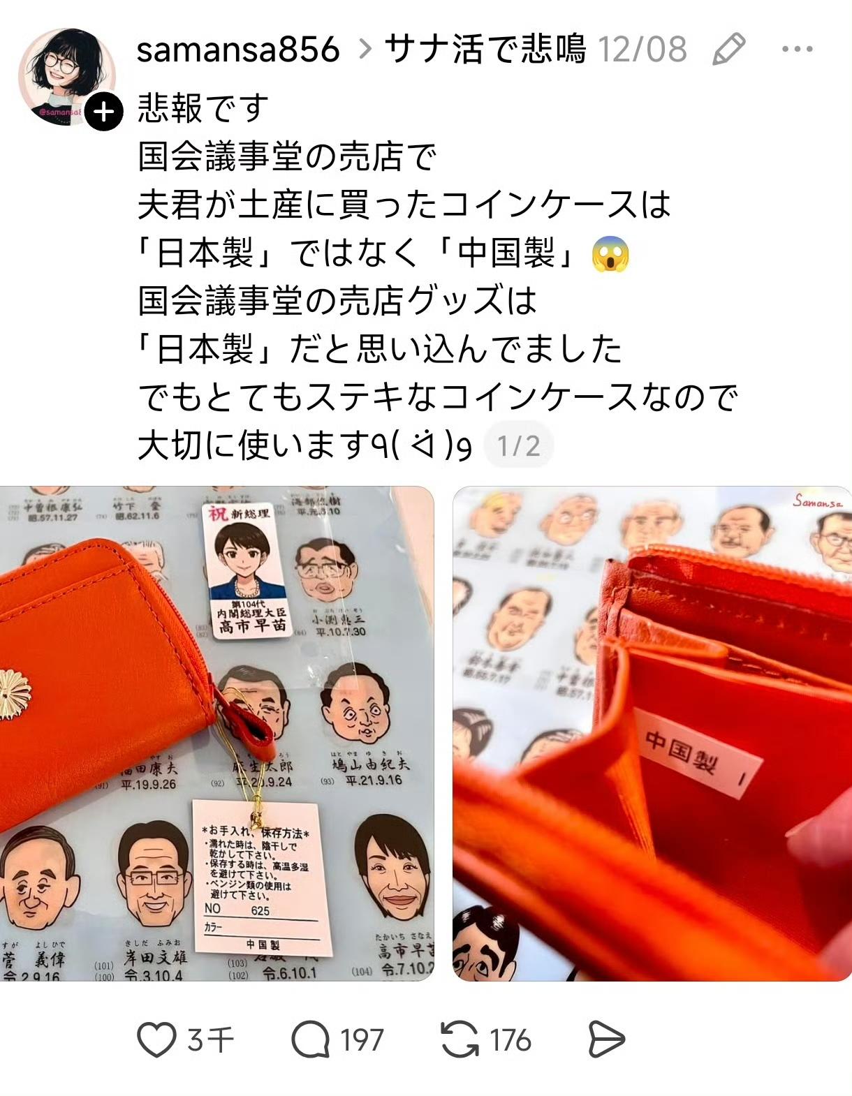 这位日本女子称,老公在国会大厦旁边的小卖部,给她买了高市早苗钱包,她打开一看,竟然是中国制造!但由于自己很喜欢这个钱包,会好好使用它的。 可以看到,这个钱包款式很简单,上面印有开了十级美颜的高市早苗画像,并写着“祝贺她当选104届日本首相”,这款钱包很受日本人欢迎。 我们主打一个应赚尽赚,尽管我们已经不使用钱包了,但为了赚日本人的钱,不得不重启生产线,毕竟谁和钱有仇呢!