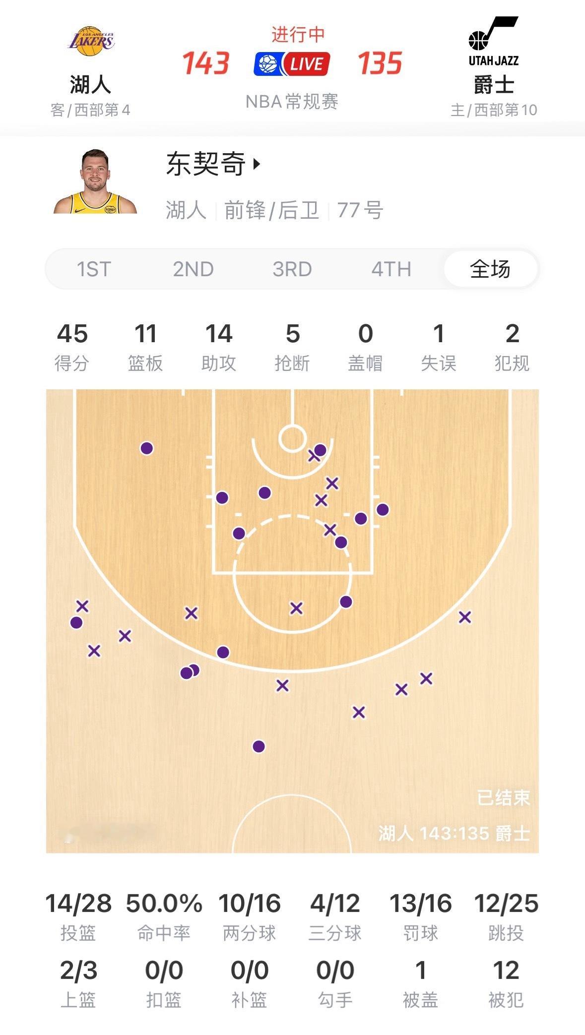 东契奇出战40分钟以50%的命中率,拿到45分11板14助攻5抢断1失误。 湖人vs爵士