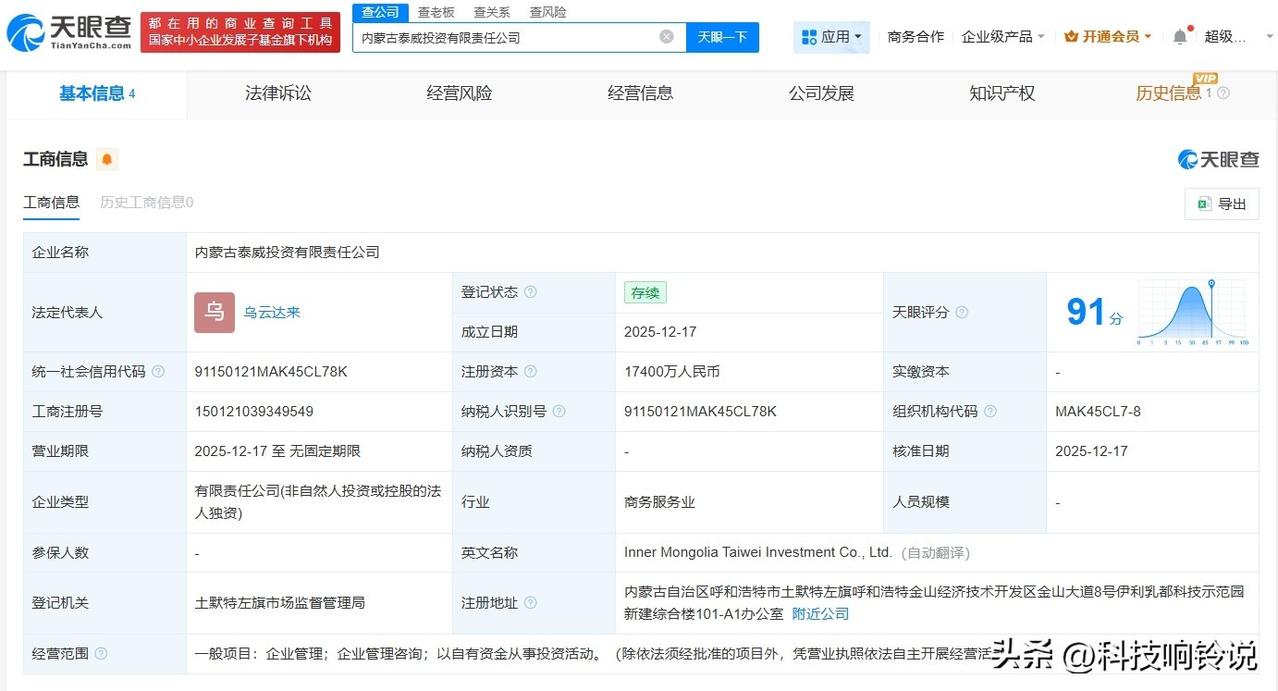 【伊利在内蒙古成立多家投资公司】 天眼查工商信息显示,近日,内蒙古永皓投资有限责任公司、内蒙古泰威投资有限责任公司、内蒙古鸿腾投资有限责任公司、内蒙古裕超投资有限责任公司、内蒙古隆卓投资有限责任公司成立,法定代表人均为乌云达来,注册资本分别为2.01亿人民币、1.74亿人民币、1.5亿人民币、1.22亿人民币、2900万人民币,经营范围为企业管理、企业管理咨询、以自有资金从事投资活动。股东信息显示,上述公司均由伊利股份(600887)全资持股。 天眼查信息: