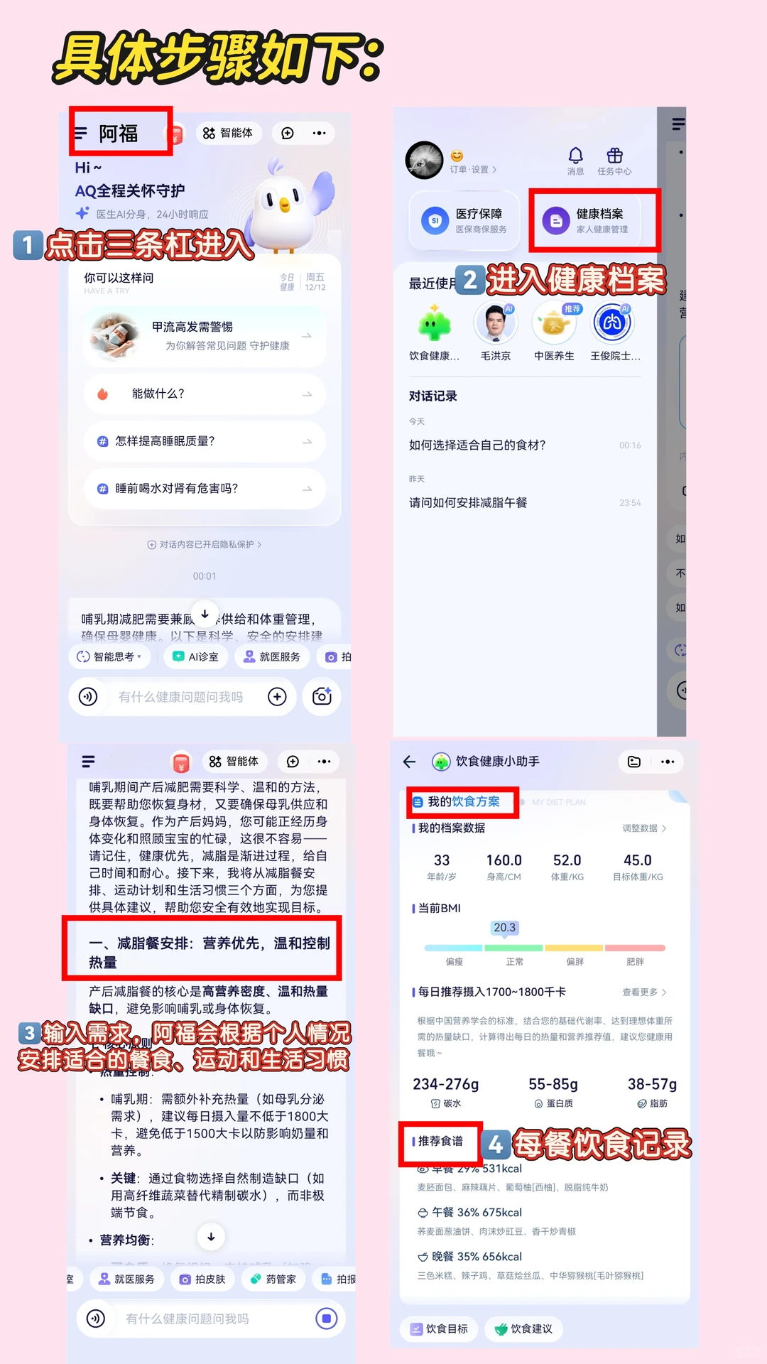 ✅输入问题,例如:“哺乳期间的减脂午餐”怎么合理安排?阿福会根据个人情况提出实用的建议,告诉我哺乳期该该怎么吃减脂餐、如何运动和安排生活作息