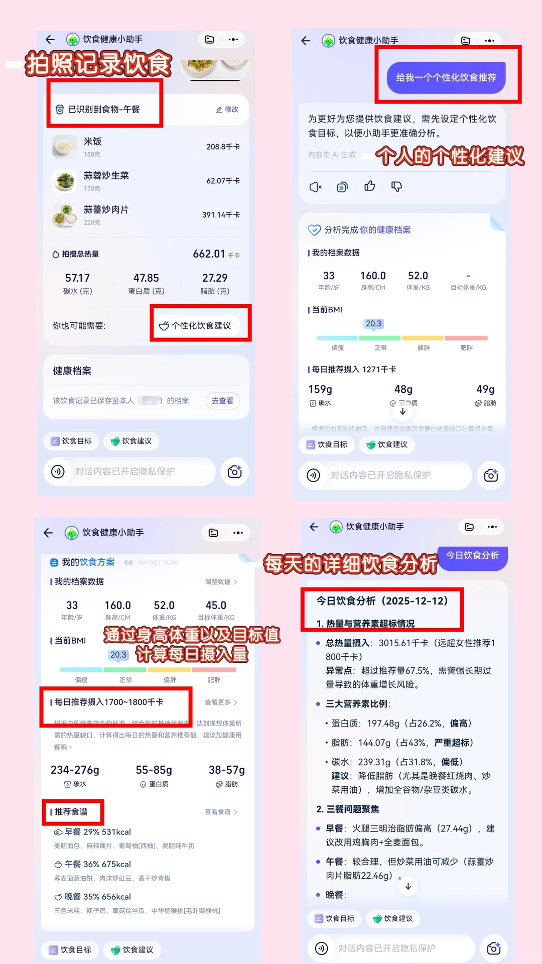✅不管我在家还是在外面吃饭,每餐吃前拍照上传,阿福还能自动分析卡路里和营养成分,如果饮食不正确还会给到“个性化饮食建议”,能帮助我很好的管住嘴,哈哈