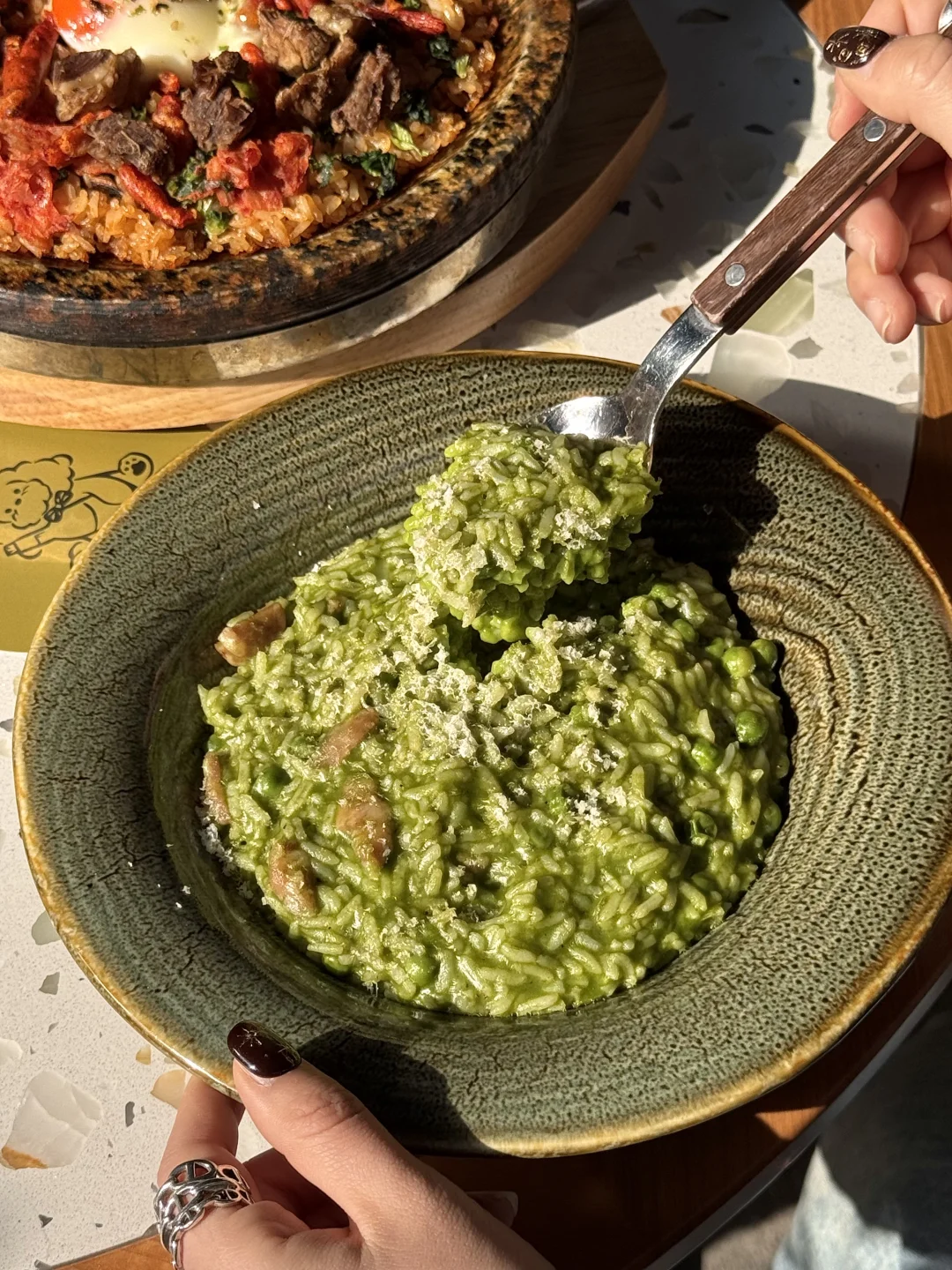 就在亚奥!!自带庭院小露台的brunch🌷真的把优雅浪漫发挥到了极致!! 已经吃了4,5回了!超爱这个辣卤牛肉石锅饭!上桌滋啦冒油好好吃啊🤤还点了热酱糯米烤春鸡、青豆烩饭、冰卡布…全都貌美又好吃!氛围好好~不管是约会还是分手都很合适!叫:sova