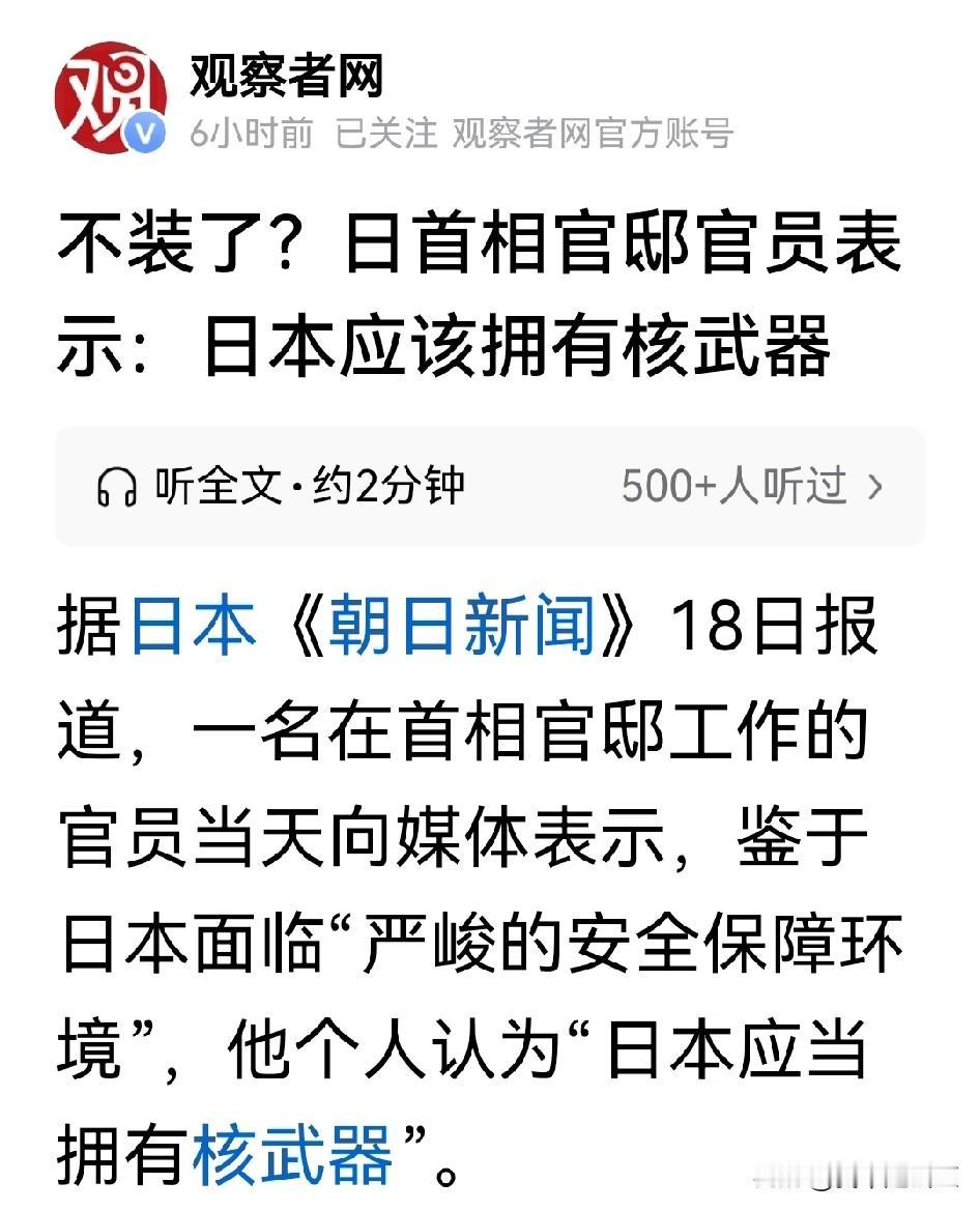 什么?日本觉得他也应该拥有“核武器”。他不是都拥有了吗? 日官员表示,因为中国,俄罗斯,朝鲜都有了,所以按道理他也应该有! 需要指出的是,日本在1945年就已经拥有了,就是那著名的“胖子”和“小男孩”,让他们成为地球上第一个实际拥有的国家。就这还不满足,还想多来些吗?