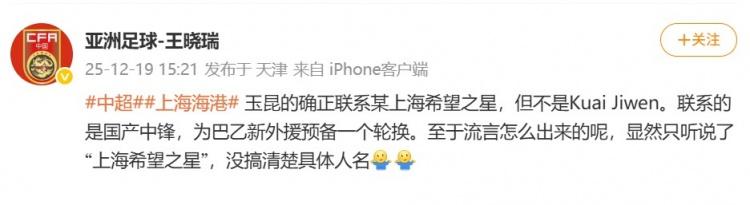 《体坛周报》记者王晓瑞对此表示:玉昆的确正联系某上海希望之星,但不是KuaiJiwen。联系的是国产中锋,为巴乙新外援预备一个轮换。至于流言怎么出来的呢,显然只听说了“上海希望之星”,没搞清楚具体人名。