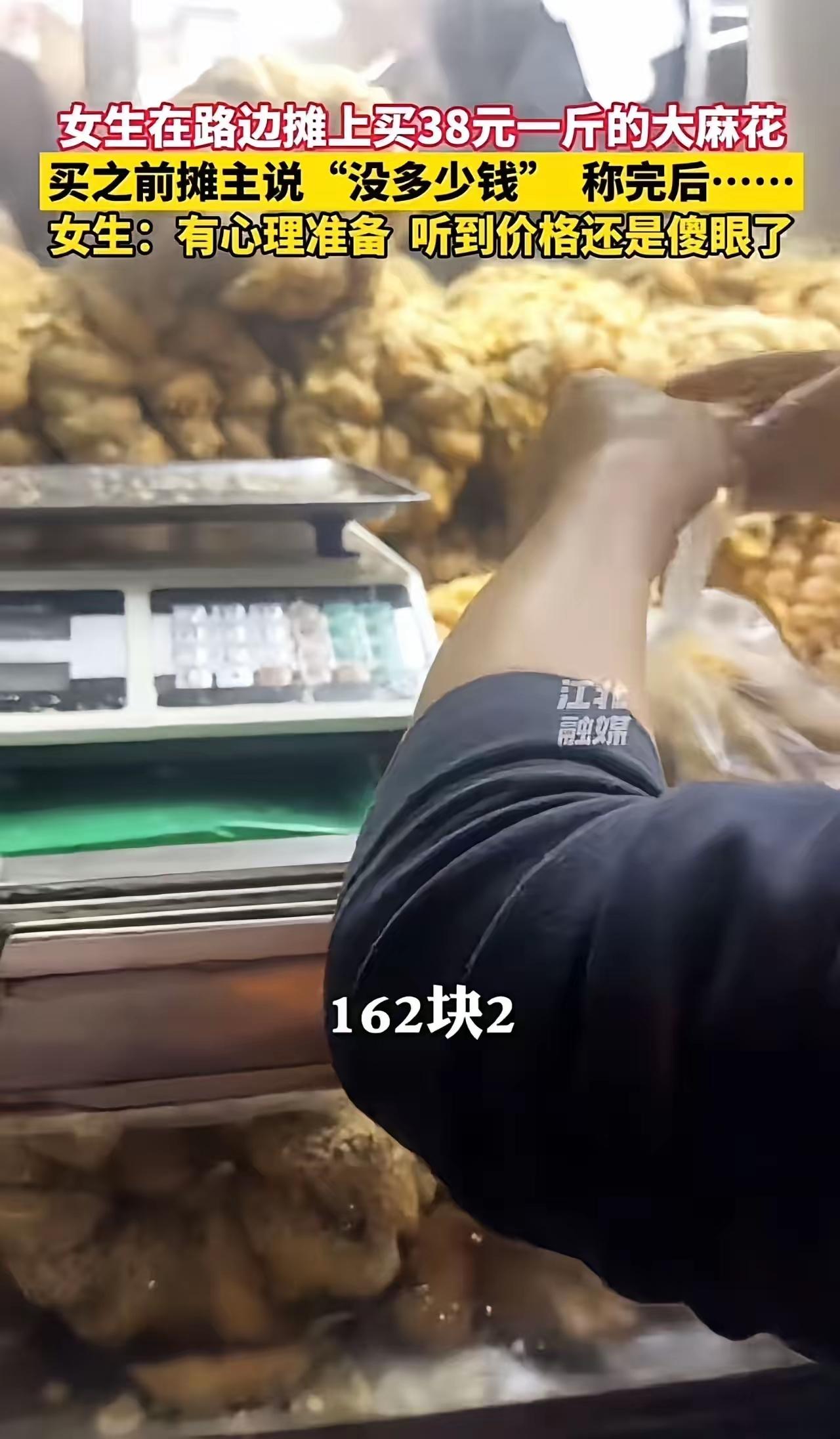 38元一斤的麻花,一刀下去我直接傻眼! 谁能想到在江门路边买根大麻花,竟踩进了“切糕式”大坑! 就像图里这样,我指着麻花让摊主切(图2),先确认了是38元一斤,摊主还拍胸脯说“没多少,放心切”,结果他刚切完往秤上一放(图1),直接喊出162块2(图3)!我当场懵了,摊主还硬邦邦甩话“切了就得要,秤不准你砸我车”,我憋屈得不行只能认栽付钱,后来才知道整根麻花居然要五六百块! 事后我越想越气,这分明就是拿捏咱对重量没概念,用“没多少”忽悠人。大伙儿以后碰到这种称重路边摊,一定要先问清楚一小块大概多少钱,别像我一样吃哑巴亏! 路边摊套路 消费避雷