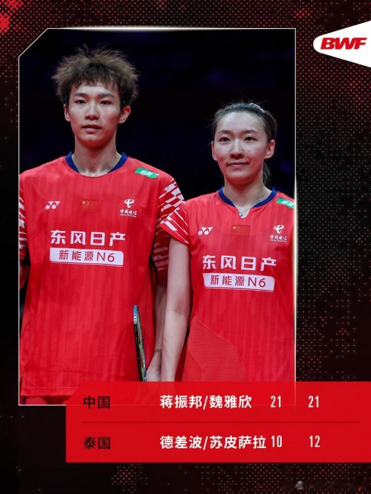 本场比赛中,蒋振邦/魏雅欣2比0战胜德差波/苏皮萨拉,比分为:21-10、21-12。