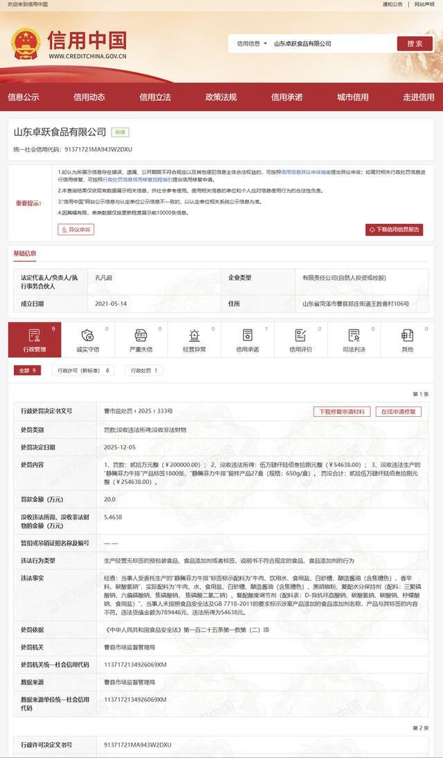 决定书显示,因“生产经营无标签的预包装食品、食品添加剂或者标签、说明书不符合规定”,涉事企业被罚款20万元,没收违法所得5.46万元,合计罚没款项约25.46万元。