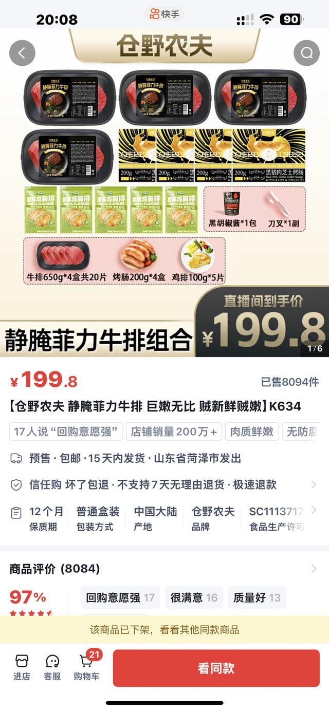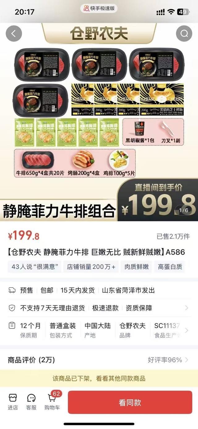 这组数据与直播间展现的销售规模存在巨大落差。仅在辛选主播蛋蛋的一场直播中,“苍野农夫”牛排的大小两个链接销量就达到3万单,对应销售额约为600万元。而在长达半年的销售期内,辛巴及旗下主播多次带货该产品,累计销售额或达千万元级别。