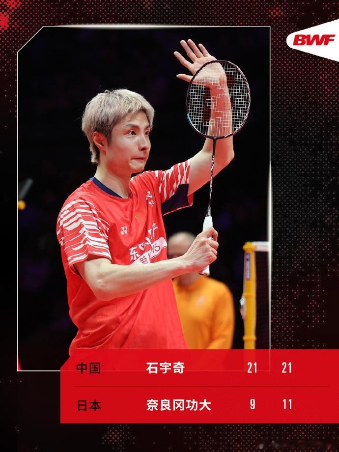 石宇奇21-9、21-11奈良冈功大,拿下小组赛三连胜。