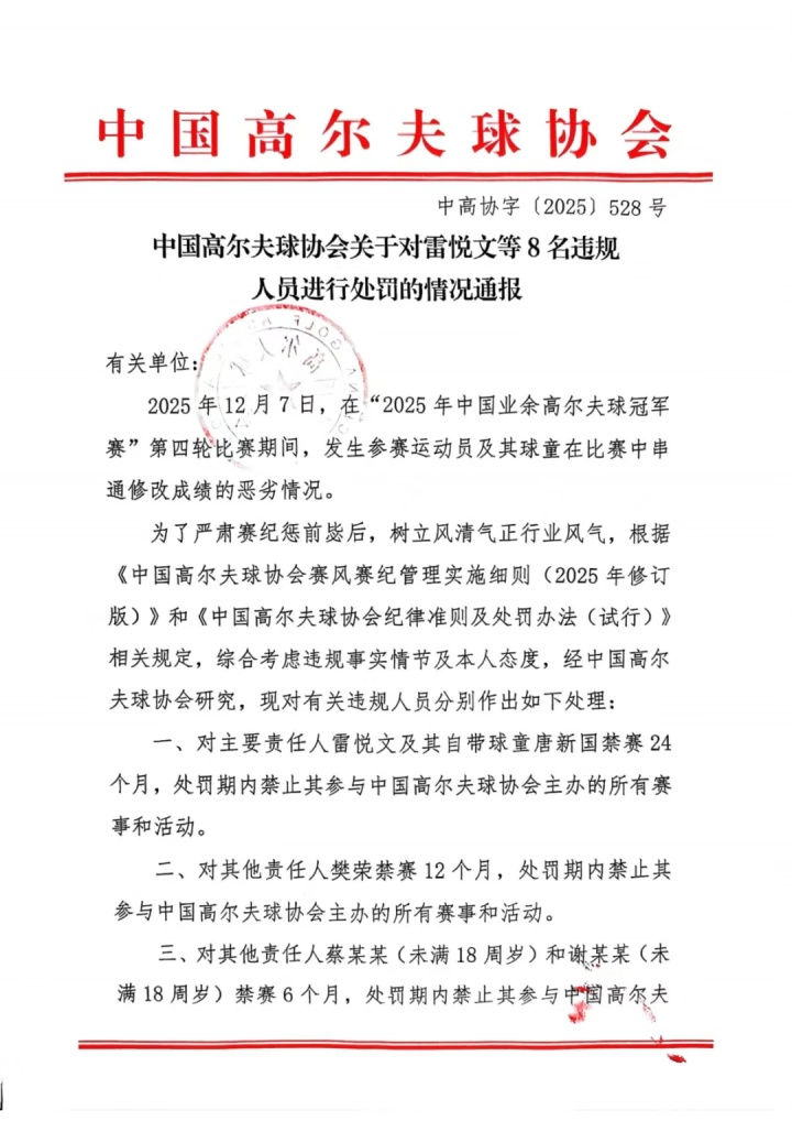 2025年12月7日,在“2025年中国业余高尔夫球冠军赛”第四轮比赛期间,发生参赛运动员及其球童在比赛中串通修改成绩的恶劣情况。
