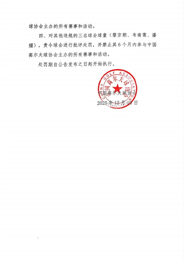 为了严肃赛纪惩前毖后,树立风清气正行业风气,根据《中国高尔夫球协会赛风赛纪管理实施细则(2025年修订版)》和《中国高尔夫球协会纪律准则及处罚办法(试行)》相关规定,综合考虑违规事实情节及本人态度,经中国高尔夫球协会研究,现对有关违规人员分别作出如下处理: