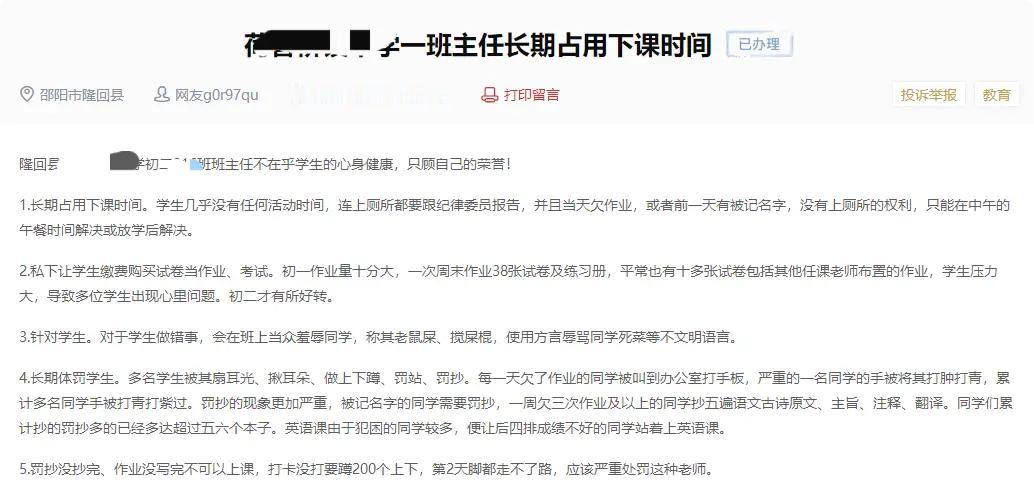 邵阳一班主任被指长期占课拖堂,校方回应:属实,责令整改。 关于邵阳隆回县某中学班主任长期占用课时、拖堂等问题的报道引发了广泛关注。校方的回应承认该教师存在部分不妥行为,已责令整改。对此,可以从多个角度进行分析和建议: 一、事件背景与现状 教育“减负”政策落实难:虽然国家出台了多项措施减轻学生负担,但在实际操作中,部分教师为了确保教学效果,可能会超时讲授,导致课间休息时间被压缩。 教师教书的出发点:一些教师希望通过延长讲授时间,帮助学生理解更深、更透,提升学习效果,但方式方法不当,影响学生身心健康。 二、存在的问题 拖堂占用课间休息时间,影响学生身体和精神状态。 严格的纪律管理(如禁止学生上厕所、惩罚行为)可能引发学生的不满与压力。 个别教师存在体罚、羞辱学生等不当行为,违反教育伦理。 三、建议与对策 教学方式创新:教师应采用高效、互动的教学方法,例如翻转课堂、案例教学等,既能提高教学质量,也能减少拖堂现象。 规范课堂管理:学校应制定明确的课堂纪律和时间管理规定,确保每节课有合理的时间安排,兼顾教学效果与学生休息。 尊重学生权益:严格禁止体罚和羞辱行为,建立良好的师生关系,营造和谐的学习环境。 学生自我管理:学生要遵守课堂纪律,合理安排自己的学习和休息时间,避免疲劳学习。 多方合作:学校、教师、家长应共同努力,关注学生的身心健康,推动科学合理的教育管理。 四、总结 合理安排教学时间、改进教学方法、尊重学生权益,是提高教学质量和保护学生健康的关键。学校应加强管理,教师应不断提升教学技能,学生也应积极配合,共同营造良好的学习环境。只有多方共同努力,才能实现教育的本质目标——促进学生的全面发展。