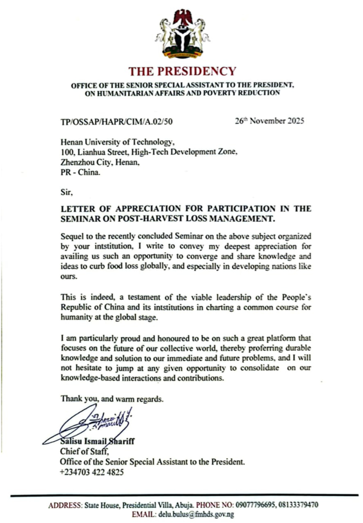近日,尼日利亚总统府向河南工业大学发来感谢信,对该校在10月10日至30日期间承办的“非盟国家粮食产后安全研修班”进行高度赞扬并表示感谢。该感谢信由尼日利亚总统首席幕僚萨利苏•伊斯梅尔•沙里夫亲笔签署。