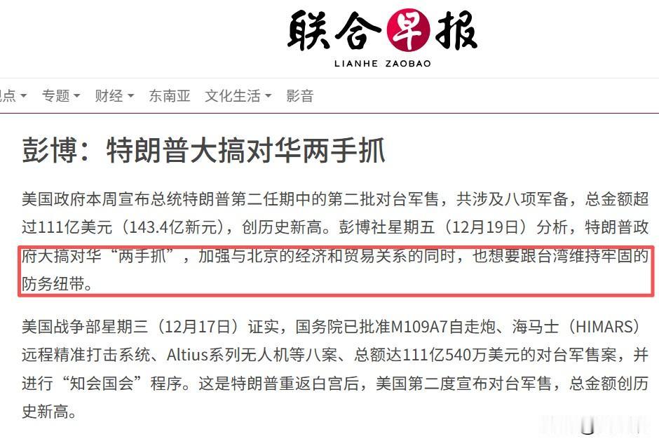 12月19日,彭博社分析特朗普之所对台军售超111亿美元,是因为特朗普想对华搞“两手抓”。一手是加强和北京的经济关系和贸易关系,另一手是想维持和台湾的牢固“防务纽带”关系。 彭博社指出,美国政府于周四晚上宣布的这笔军售,有两个特点。一是除了尚未分派、甚至是都还未公开招标的战术指挥控制网络外,其余系统此前都曾向台湾出售过。二是美国的这笔军售,并不包括此前出售给台湾的“鱼叉”反舰导弹、“SLAM”增程型反舰导弹或Mk-48重型鱼雷等。 具体来看,美国的这笔对台军售涵盖了八大项目,主要是导弹、海马斯、无人机和自行火炮等等。而围绕着这笔军售,各种分析可谓是五花八门,这里给大家简单介绍几个。 第一种就是彭博社的观点,特朗普希望借此能对中国两手抓,一手抓和中国大陆的经济贸易发展,另一手抓和中国台湾的“防务关系”。 第二种是德国之声引述的美专家的观点,他认为特朗普通过此举缓解了外部对美国的质疑。进一步来讲,特朗普希望通过此举向中国传达一个信号:特朗普政府不会将台湾纳入任何与中国的『大型交易』,也不会在北京施压要求降低对台支持时退让。(专家的话) 第三种是美国智库专家的观点,该专家认为,过去几十年来,美国政府一直在台湾问题上采取模糊政策。而这次的对台军售,其实也是模糊政策的延续。 不过,笔者个人认为,美国这次的军售有三个目的。一个是刚才提到的,是美国政策的延续。其实不管是哪个总统上台,都少不了对台军售。一个是美国想“放弃”台湾,而在“放弃”之前,美国希望通过各种手段“掏空”台湾。还有一个是武装台湾,以消耗大陆。 对这三个目的,第1个不多说了,重点聊聊后2个。 其实,从乌克兰问题上就能看得出来,美国不可能出兵“协防”台湾。而台湾本身是一座岛屿,真要是打起来,四周派上军舰一围,进不去也出不来。在这样的背景下,美国只能提前加速“武装”台湾。 当然,这些武器最终是否能交付给台湾,那就是另外一个问题了,不是美国考虑的问题。他们唯一考虑的,就是台湾的钱什么时候能到账。所以,这就是在变相的“掏空”台湾。 值得注意的是,中国对美国的这笔台军售不可能只停留在口头抗议上,肯定要拿出反制手段。目前,中国已经取消了十几吨的美国白小麦订单。除此之外,肯定还有其他手段。甚至于说,特朗普的访华行都要打上一个大大的问号。 而2026年又是特朗普的中期选举年,他必须和中国搞好贸易经济关系。否则的话,选票不稳,之后的大选怎么办?所以,中国的反制必须要让美国感到疼。只有感到疼了,特朗普才不会如此的放肆。