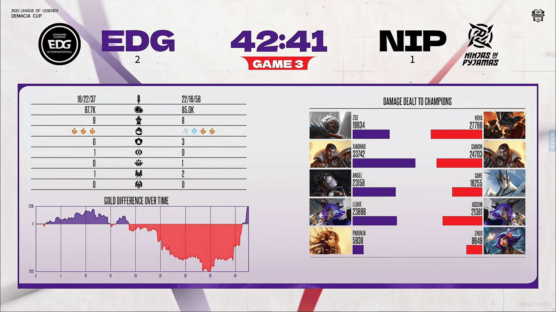 比赛第42分钟,EDG打出一波2换5团灭NIP后一波。