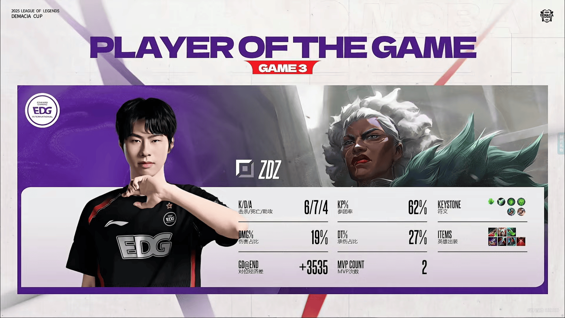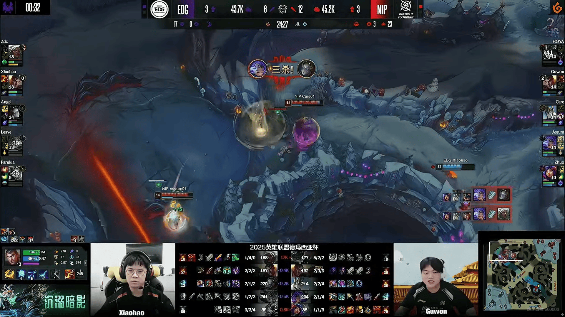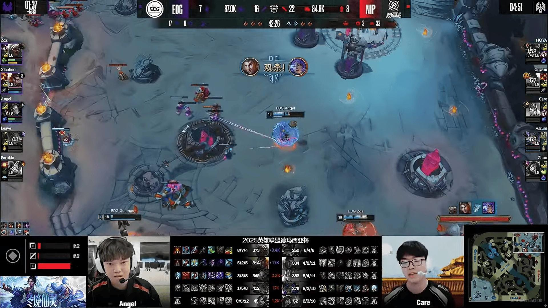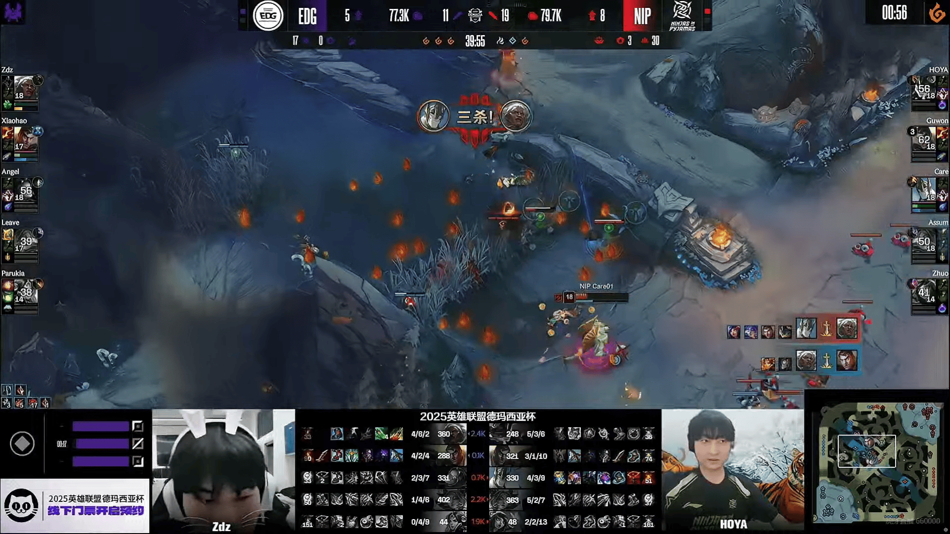 但此后EDG逐渐扳回局势,比赛第39分钟,两队在中路鏖战,Care加里奥砍下三杀但EDG打出3换4。