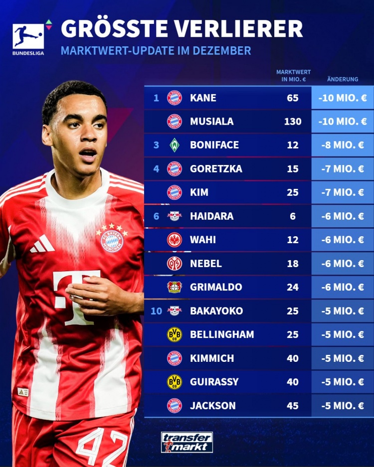 直播吧12月19日讯德国转会市场列出了德甲身价下跌榜,凯恩、穆西亚拉身价下降1000万欧居首。