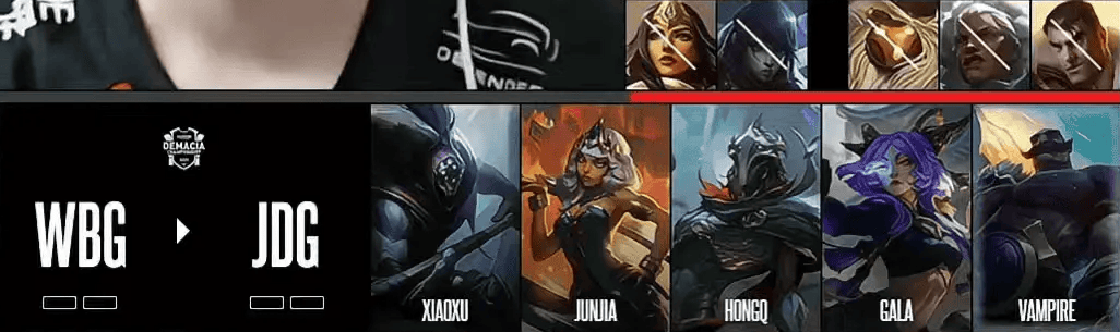 JDG选用:Xiaoxu贾克斯、Junjia奇亚娜、HongQ维克托、GALA芸阿娜、Vampire布隆