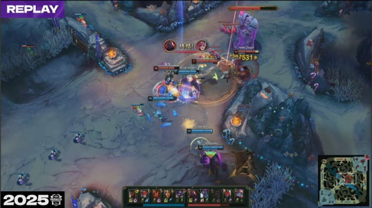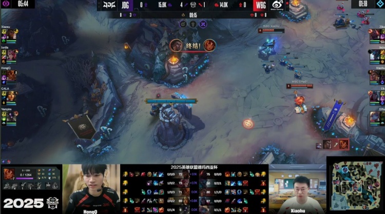 [20:18]中路团战,Xiaohu梅尔反弹岩雀大招,HongQ岩雀被伤害灌死,Vampire牛头又被Elk一箭射掉,WBG打出0换2,经济落后3k。