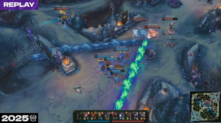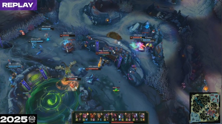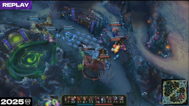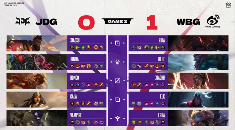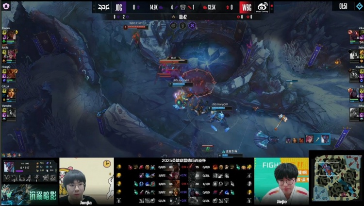 [15:12]中路团战,HongQ岩雀开车送到Jiejie嘴儿里,Erha波比也被击杀,双方打出1换1,Xiaoxu奎桑提推掉WBG下路一塔,中路再战,Elk韦鲁斯被HongQ岩雀抬回后又被Junjia蔚锁头互换,GALA希维尔点掉Jiejie,JDG打出1换2。