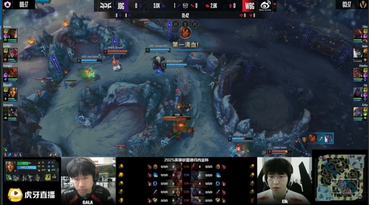 [8:32]巢虫团,HongQ岩雀抬回xiaohu梅尔,随后Vamipre牛头二连开团被杀,GALA希维尔击杀Erha波比,Jiejie与xiaohu跟着阵亡,JDG打出1换3,经济领先1k。