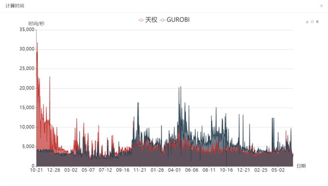 而在启用南方电网自主研发的电力求解器“天权”后,平均计算时间缩短至1827秒,计算性能平均超越Gurobi14%,最大领先幅度达38%,同时运算误差降低23%,运算稳定性提升21%。