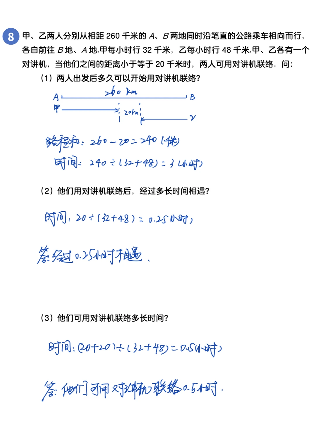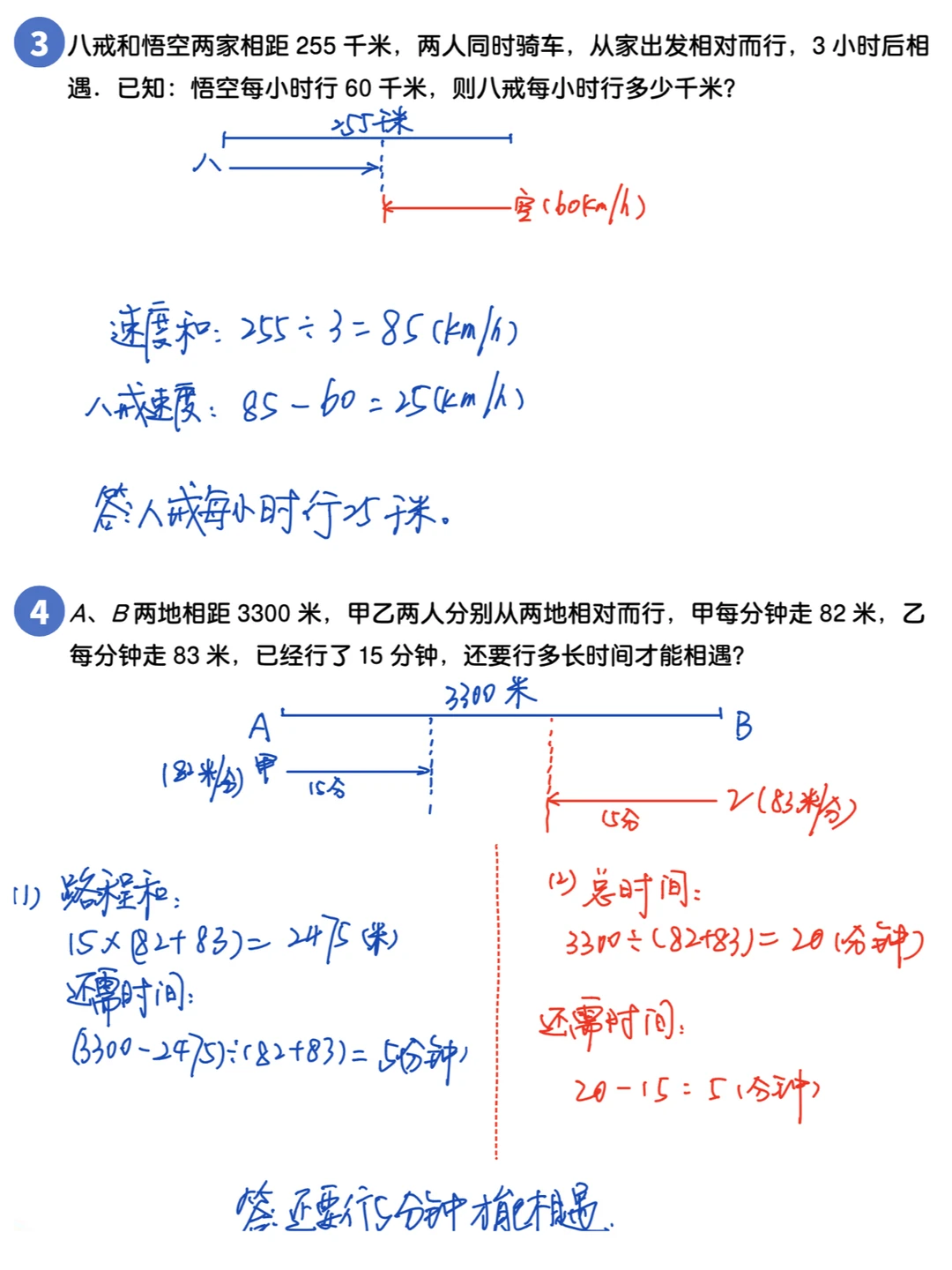 2️⃣相遇时间=总路程÷(甲速+乙速)