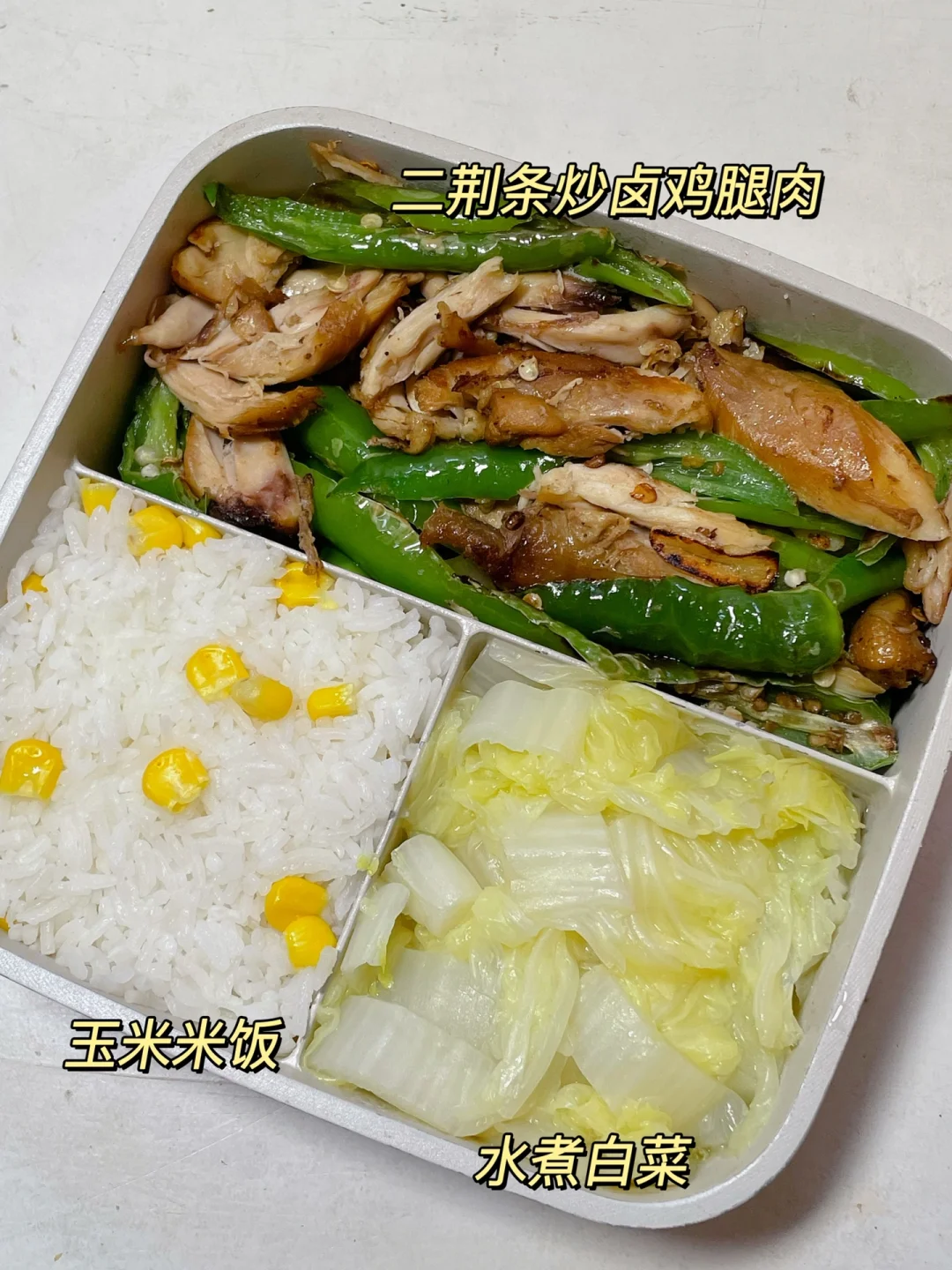 📍玉米饭+辣椒炒鸡腿肉+水煮白菜