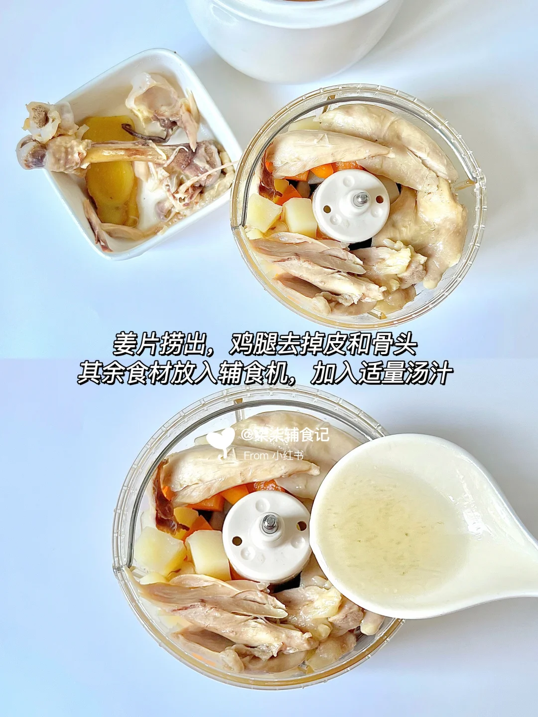 ▫️煮熟把姜捞出,鸡腿去掉皮和骨头,其余食材放入辅食机,加入适量汤汁,搅打成泥。