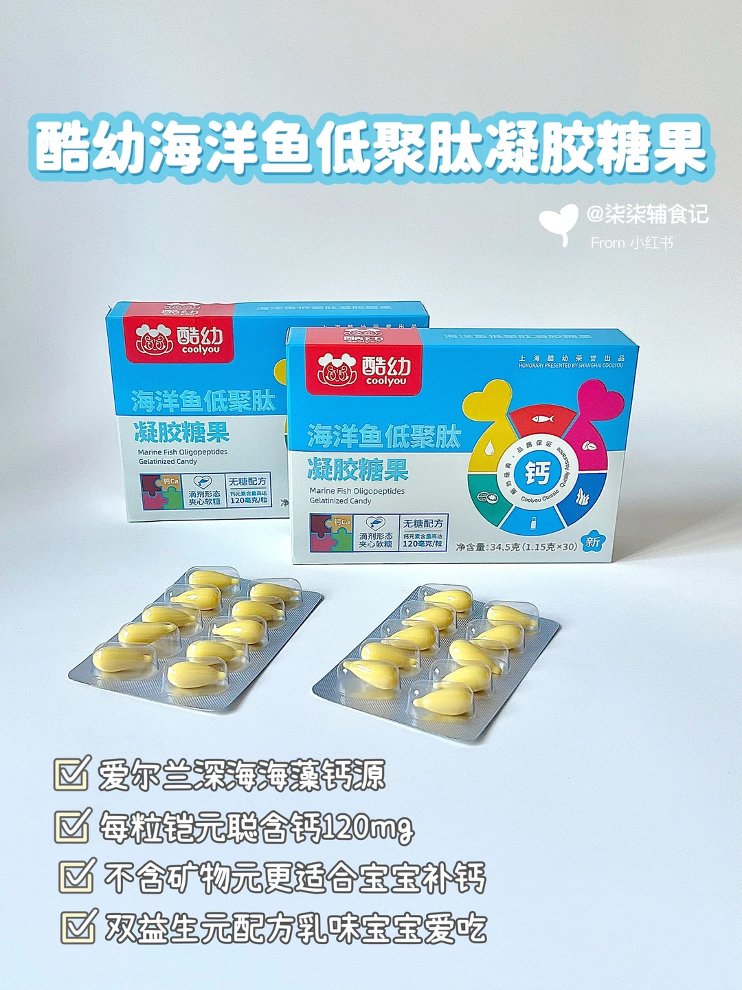 浓汤宝营养丰富,平时担心宝宝营养不够、缺钙可以跟柒柒吃同款酷幼小金鱼海藻钙,选它家主要是因为含钙量高,性价比不错,进口爱尔兰深海海藻钙,天然的植物钙,里面还添加了核桃油,作为辅助配方,完全满足日常所需,每个都是独立包装,方便携带,不会氧化粘粘到一起,我都是剪开挤嘴里给柒柒吃的,大一点的宝宝可以直接一整个嚼着吃。