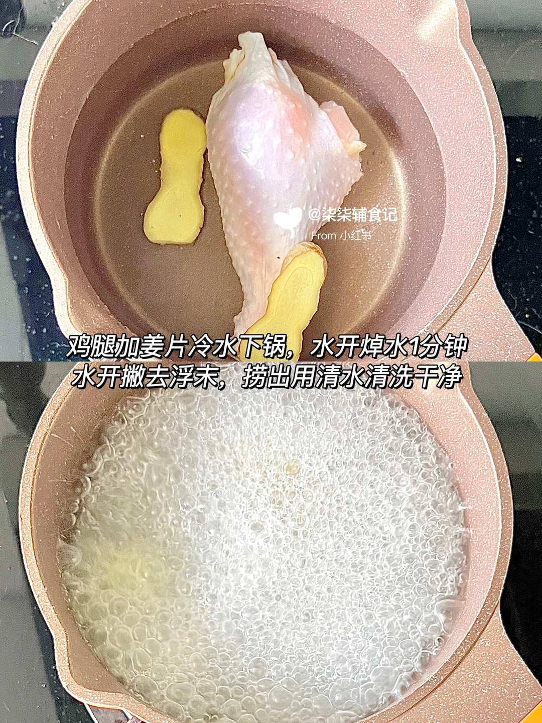 ▫️鸡腿冷水下锅加姜片焯水去腥,煮开撇去浮末,捞出把浮末清洗干净。