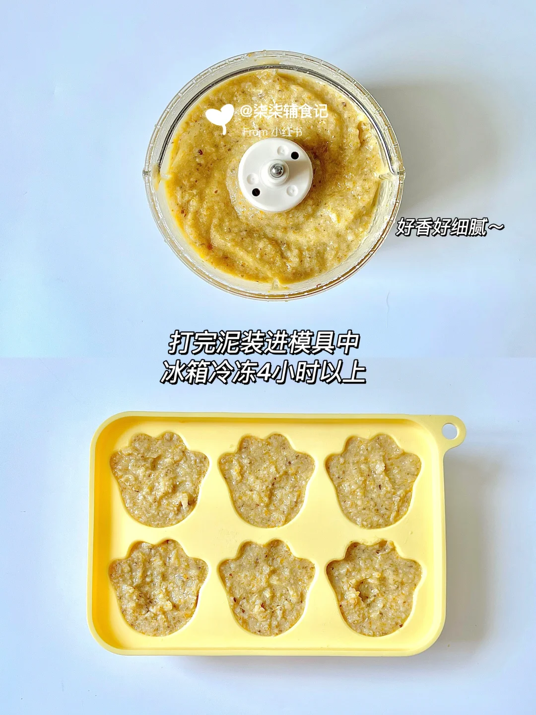 ▫️打好的泥放进硅胶模具,冰箱冷冻4个小时以上取出放密封袋里,继续冷冻保存。