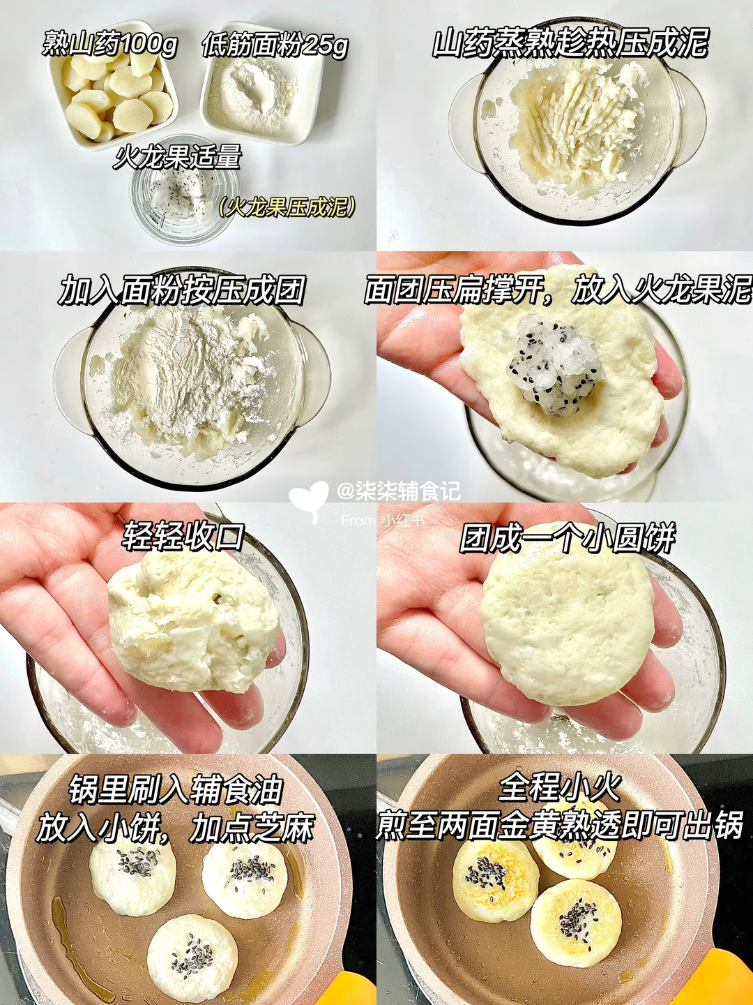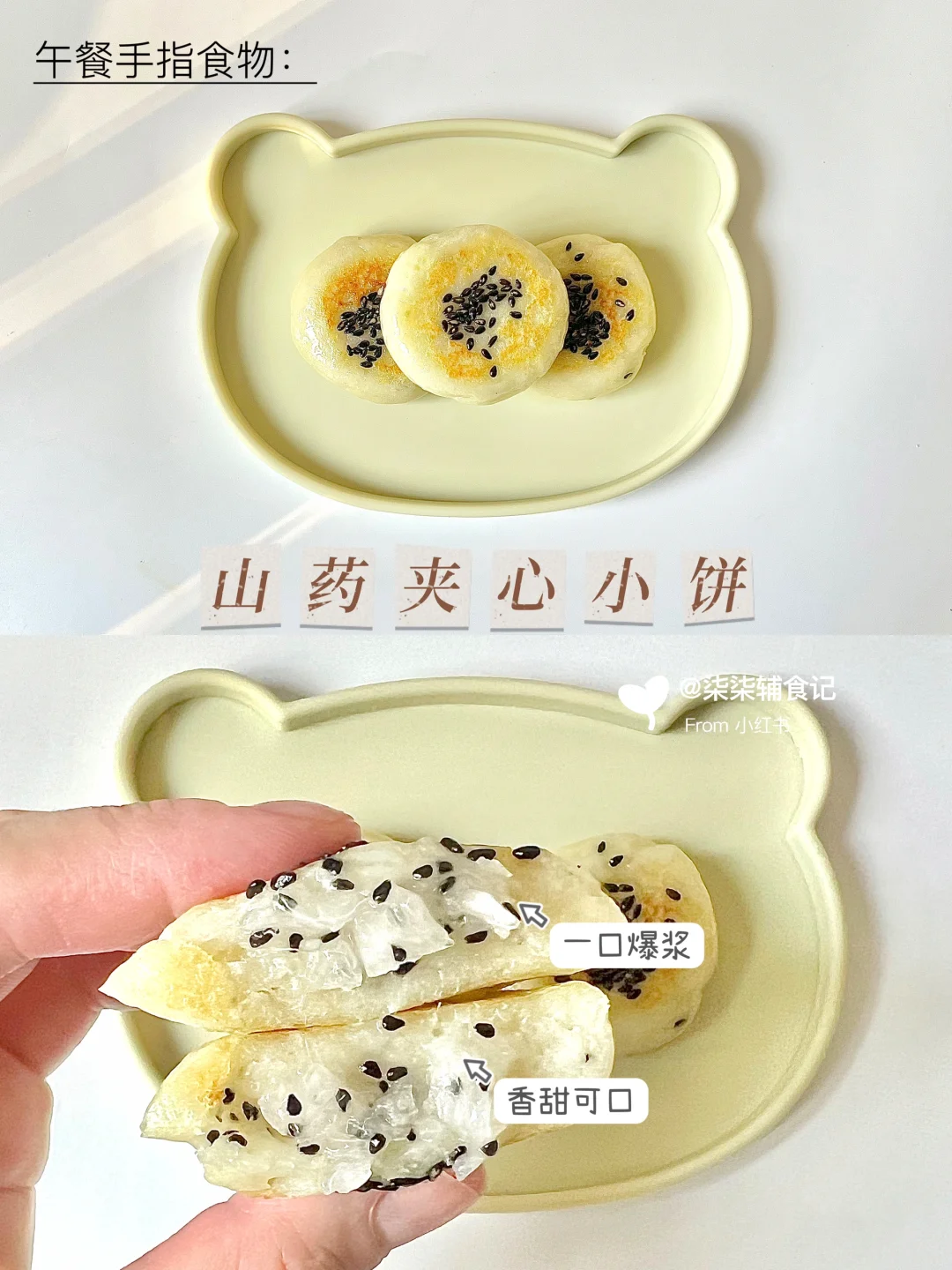 夹心饼:正宗的铁棍山药蒸完水分很少的,加20-25g面粉就足够啦!水分太多的山药可能得多加点面粉,不然会很粘手的。或者手里抹点辅食油防粘👍