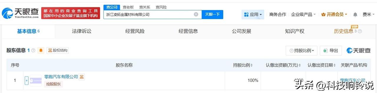 【零跑汽车在浙江成立金属材料公司 注册资本4000万】 天眼查App显示,近日,浙江凌拓金属材料有限公司成立,法定代表人为曹力,注册资本4000万人民币,经营范围包括金属材料销售、钢压延加工、金属材料制造、金属制品销售等,由零跑汽车有限公司全资持股。 天眼查信息:
