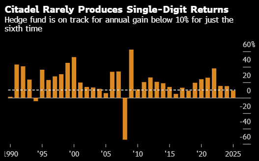 即便如此,鉴于年内交易时间仅剩不到两周,今年可能会成为城堡自1990年成立以来第六个年度回报率低于10%的年份,凸显该公司近年来依赖商品交易来提升回报。