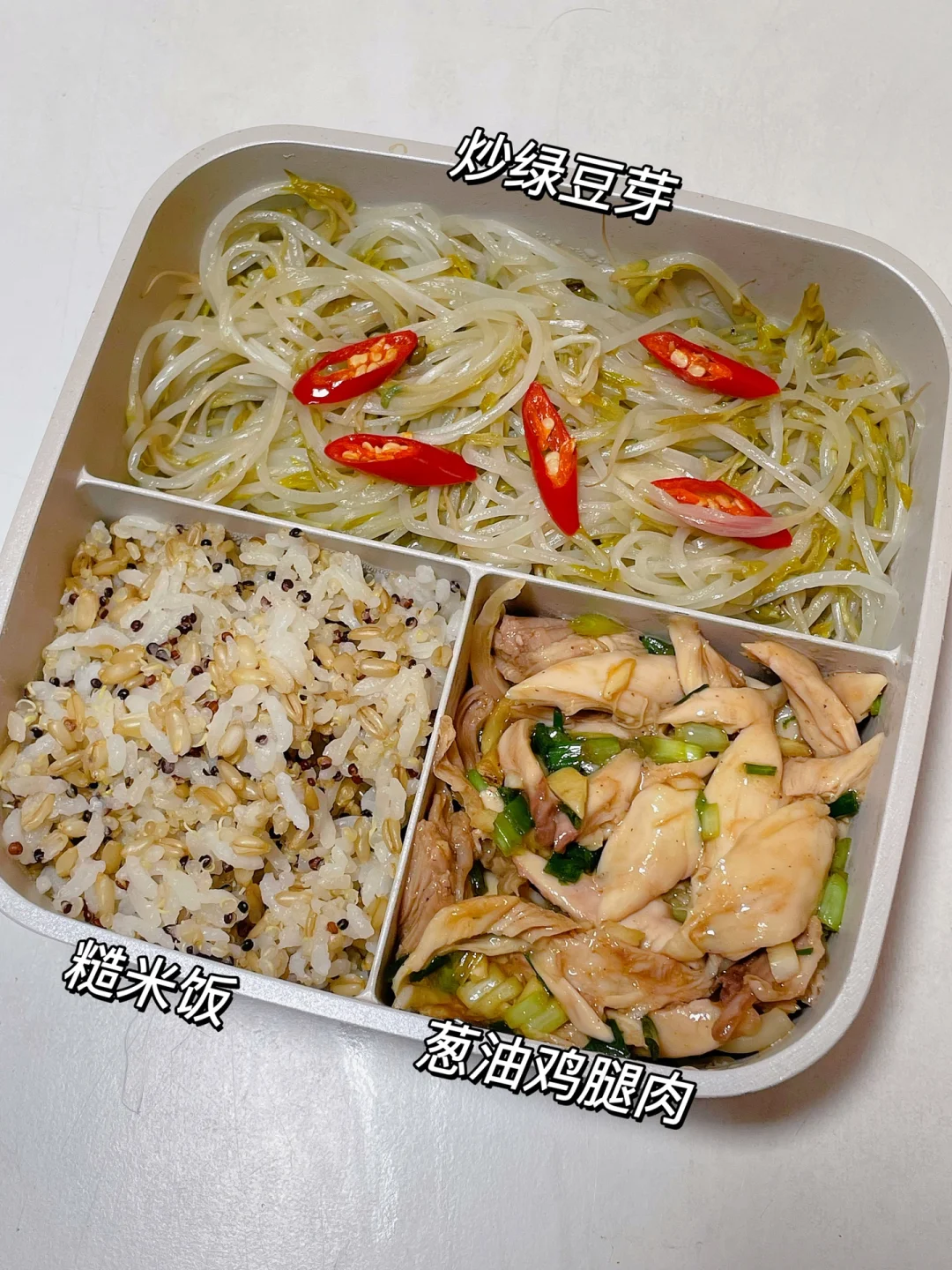 📍糙米饭+葱油鸡腿+炒绿豆芽