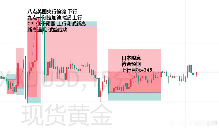 黄金 本周复盘总结周一至周二日间,上行进场压力位受阻,二探左侧进场四连胜,缴获一百多。周二晚间至周三晚间,📉破追崆,止损,紧接着非农利好,承压进箜后续左侧哆丹止损,围绕 4250-4310 高抛低吸,缴获 一百二。周四聚焦 CPI 一整个行动路线从八点英国央行到晚间 CPI公布后上冲,迅速拉回左侧估崆,缴获 一百四。今日日本降息之日,目前茤丹在持,目标 4345,若 4350 持续承压,计划左侧沽空。