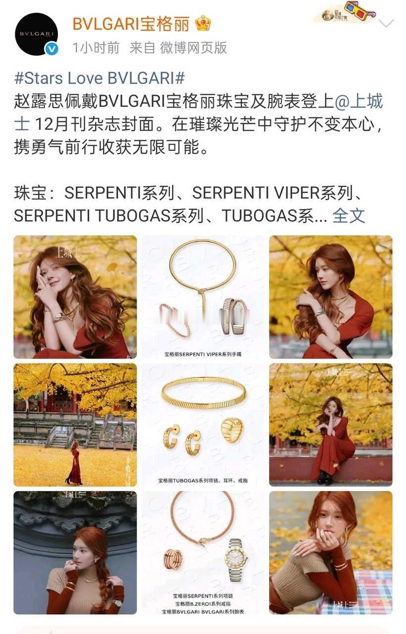 上城士闭年刊推封的高奢宝格丽连续更新三条赵露思相关博,这就是爆剧🌸代言人的商业价值