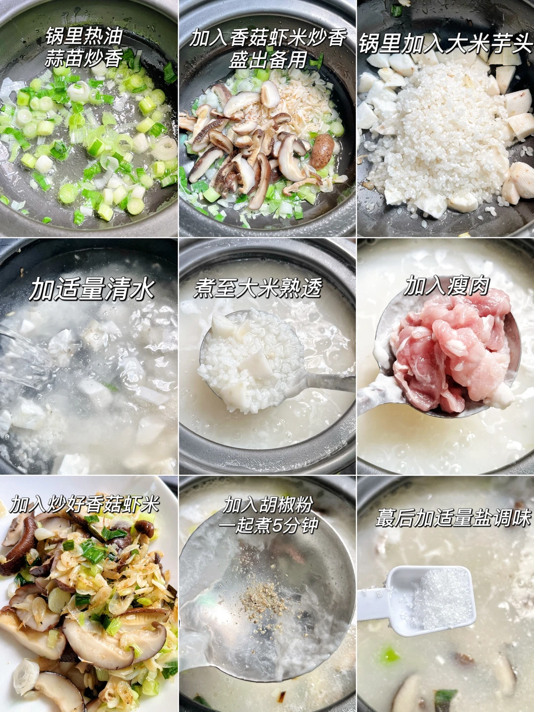 夏天太热,没啥胃口,可以试试这个芋头虾皮瘦肉香菇粥,鲜甜又好吃,自己做的干净料又足,虾皮能补钙又营养,也可以更好的补充蛋白质。 下面分享一下做法。 准备食材🫕 芋头、虾皮、瘦肉、香菇、蒜苗、大米 做法🥘 1.食材切好,洗净备用。 2.油热加蒜苗炒香,加入虾皮,香菇炒香备用。 3.芋头与大米加适量清水,煮至熟透。 4.再加入瘦肉和炒好的虾皮香菇、胡椒粉,一起煮5分钟。 5. 蕞后加入少许盐调味。 这个粥鲜甜可口,做法又简单,很适合没胃口,又想吃点清淡有味的,大人小孩都可以吃。