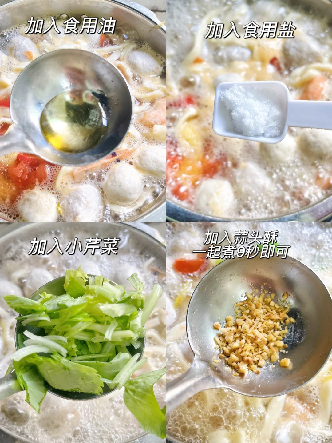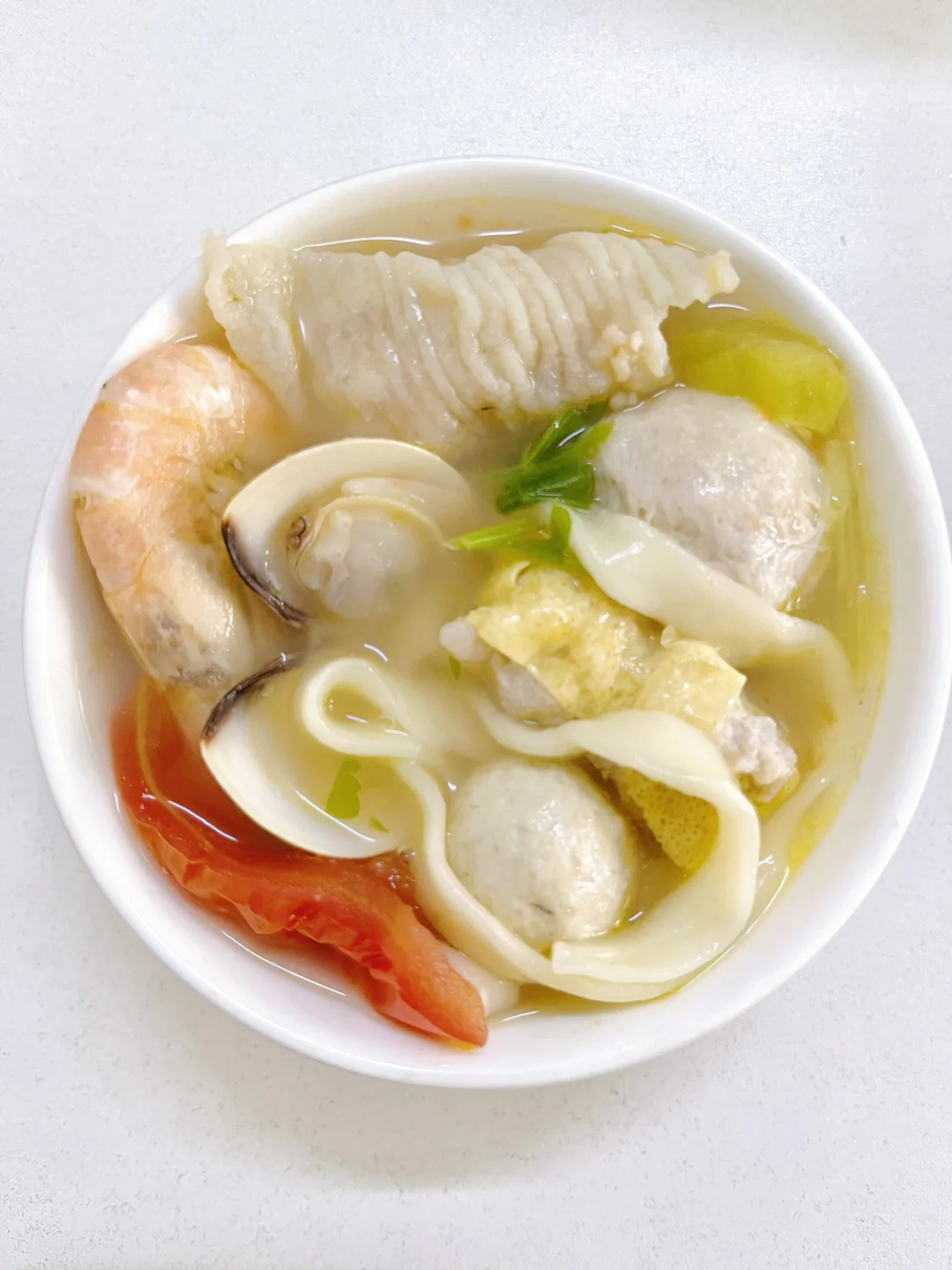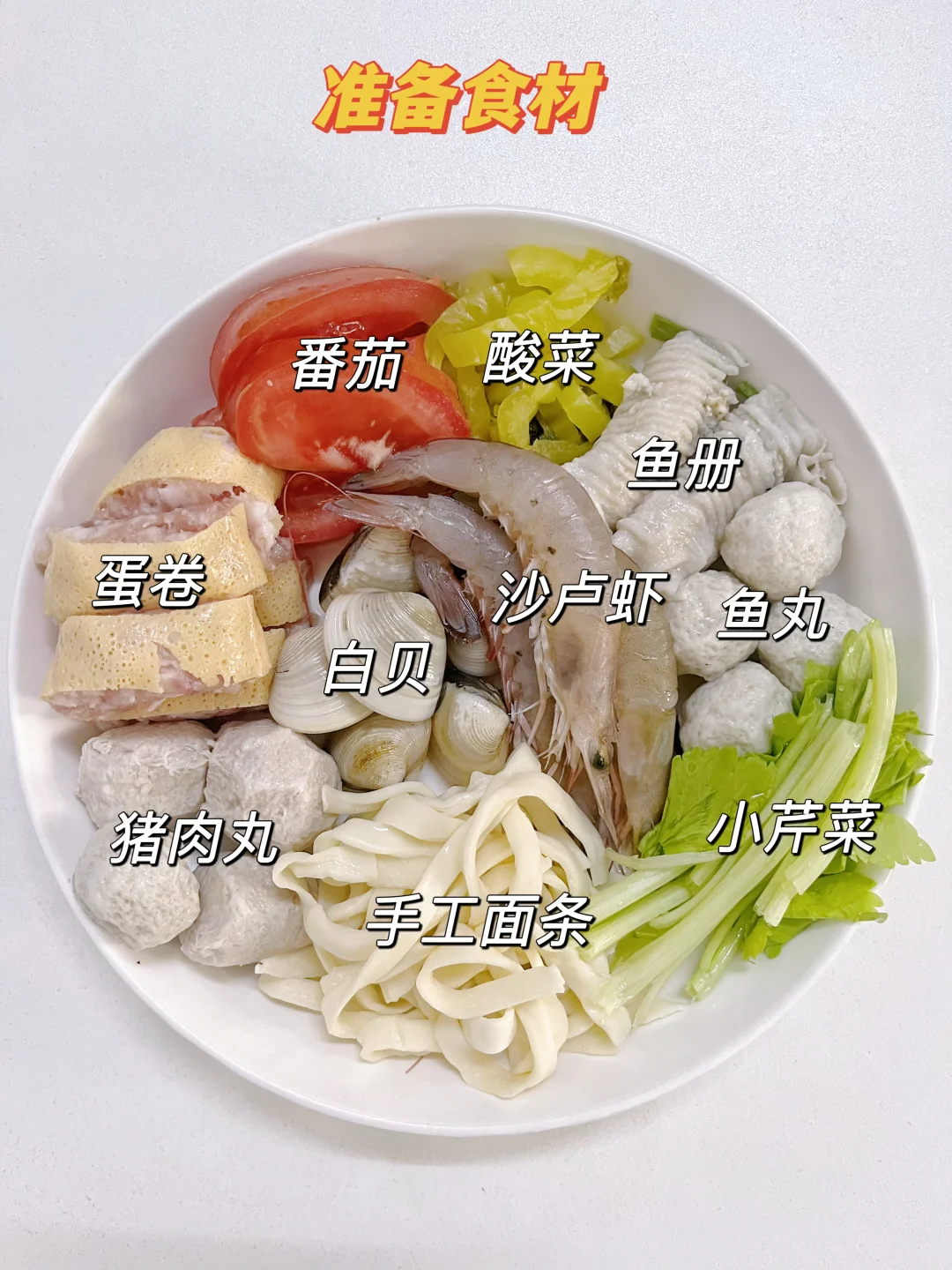 手工面条、番茄、酸菜、蛋卷、鱼册、鱼丸、沙卢虾、白贝、猪肉丸、小芹菜