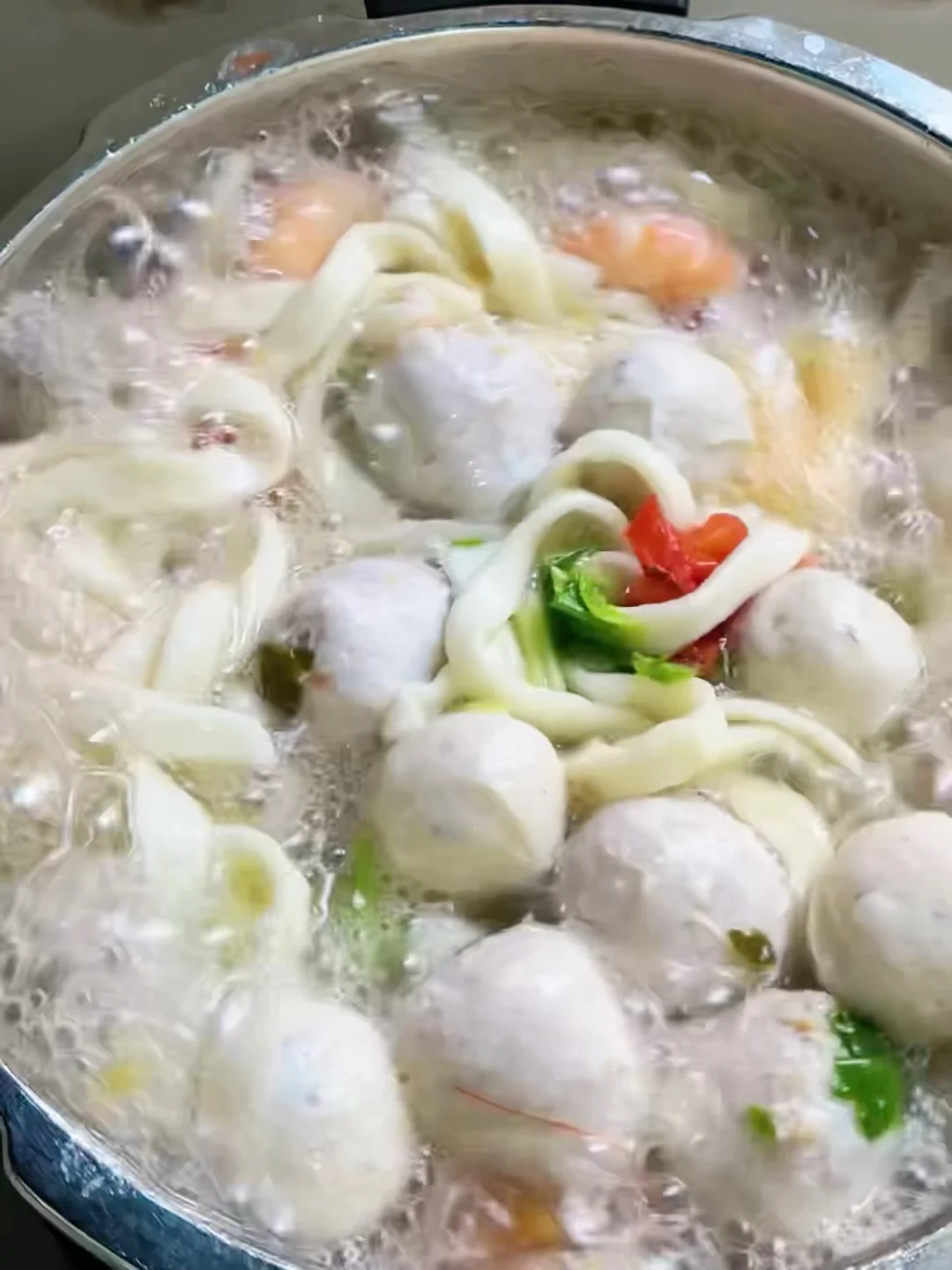 1️⃣ 锅里加水,放入番茄煮至烂乎、加入蛋卷、沙卢虾、压碎胡椒粒、鱼册、鱼丸猪肉丸、酸菜、面条,一起煮熟。