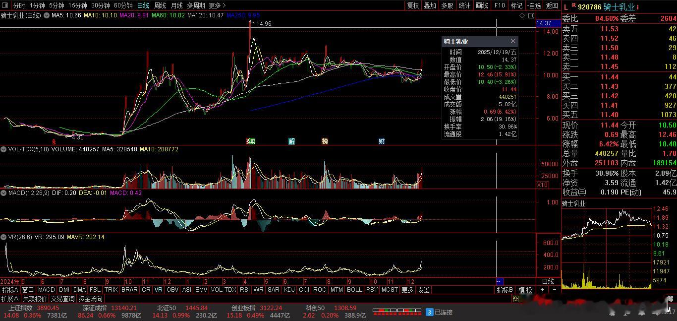【财富晚茶】今日股市收评:深指涨0.66%:种植震荡回升玻璃杀跌导语:作者系《网易号》优质财经领域创作者。曾经原创作者和知名网易号旅游领域创作者。大跨度行业等的写作,颇受网友喜爱。作品发表于2025.12.19.15:18优雅端庄晚风。(标题作品:新加坡滨海湾花园:以“超级树”和花穹温室闻名。获吉尼斯:“全球最大玻璃温室”纪录。每年接待:游客超8700万人次)一、视野焦点:恰似“火眼金睛”920786 骑士乳业 盘中 05涨1、突破三年箱顶视野盘面:四底震荡:触底新高。2025-12-19 截至15:00:股价报收:11.44元。该股上涨:6.42%。成交总量:440257手,成交金额:5.02亿元。总换手率30.96%,观总市值:23.92亿元。流通市值:16.27亿元。2、牧草奶牛翘楚主营业务:牧草种植-牛场运营-奶牛集约化养殖-优质生鲜乳供应的研产和销售。公司品牌:全产业链乳制品综合供应商和头部企业。3、经营优良企业财报透视:2025-09-30 三季度报:公司营收:9.1353亿 同比增24.01%。公司净利:3909.7136万 同比增281.30%。二、多方强势:恰似“弱肉强食”1、博弈追踪盘面第一、沪深盘面透析沪深回放:跌宕起伏。早盘:高开二针,六涨二跌。午盘:一跌二涨,一跌三涨。尾盘:三涨二跌,次高红盘。第二、透析沪深指数追寻沪深:跌宕起伏:沪指涨0.36%(014.08点),报03890.45点,成交额07381亿。深指涨0.66%(086.24点),报13140.21点,成交额09878亿。创指涨0.49%(015.18点),报03122.24点,成交额04447亿。北指涨0.99%(014.13点),报01445.84点,成交额00230亿。沪深北市:合计成交:17489亿元。2、复盘沪深个股第一、今日个股视野今日观察:涨跌互动。4477股上涨,93个股涨停板。904股下跌,8跌停板。沪深北市:合计成交17489亿元。三、沪深阳棒:恰似“阳春白雪”1、洞察机构尾盘主旋律:沪强深弱,尾盘兑现。沪指距9:31-15:00:前2小时放量盘升,中1小时略量盘跌,后1小时略量盘升。深指距9:31-15:00:前1小时放量盘升,中2小时略量盘跌,后1小时略量盘跌。沪深两市:合计成交:17489亿元。四、资金流向:恰似“水落石出”1、目击主力资金Wind统计显示:主力资金全天净流出44.44亿元;其中,创业板主力资金净流出38.81亿元;沪深300成份股主力资金净流入9.88亿元;科创板主力资金净流入9.25亿元。所属的31个一级行业,今日有12个行业主力资金呈现净流入,其中,汽车行业主力资金净流入最多,净流入金额为23.48亿元;行业主力资金净流入居前:机械设备、有色金属、传媒等。19个行业主力资金呈现净流出,其中,电子行业主力资金净流出最多,净流出金额为29.79亿元;行业主力资金净流出靠前:医药生物、交通运输、食品饮料、国防军工、轻工制造等。2、龙虎榜晴雨表收盘龙虎榜数据:机构席位资金合计:净卖出约2778.51万元。其中,净买入的个股11只,净卖出的个股12只。机构净买入最多:航天智造,净买入金额9061.83万元;机构净买入居前:山子高科、西部材料、华人健康等股。机构净卖出最多:通宇通讯,净卖出金额约9319.53万元;机构净卖出居前:皇氏集团、雪人集团、法尔胜等股。3、涨停板跌停板第一、板块涨停上涨板块:海南板块、海南自贸、土地流转、青海板块、一般零售等。下跌板块:林业、科创板创新、元器件、玻璃纤维、次新股等。第二、个股涨跌沪深个股:涨多跌少,多方强势,略胜一筹。其中,4477股上涨,93个股涨停板。904股下跌,8跌停板。沪深北市:合计成交17489亿元。4、下周趋势先知第一、沪指预测12月22日:沪指突破阻力:03902点看涨,前程似锦;跌破支撑位:03871点看跌,日暮途穷。第二、深指预测12月22日:深指突破阻力:13217点看涨,鹏程万里;跌破支撑位:13070点看跌,不堪造就。五、本创作者:恰似“优质网易”投资投机迷茫之中:给予尽可能有帮助:资本市场风险自负。(优雅端庄晚风《网易号》优质财经领域创作者和原创作者; 违者必究)